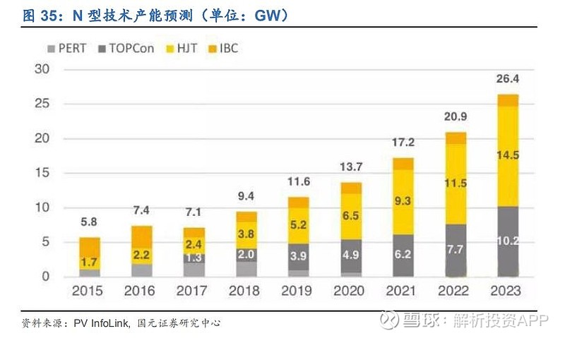 目前全球HIT电池规划产能已超15GW,但实际产能在3-4GW左右。根据PV InfoLink预测,预计到2023年N型电池产能将达到26.4GW,而HIT电池产能将达到14.5GW,相比2018年HIT 产能提升约4倍。