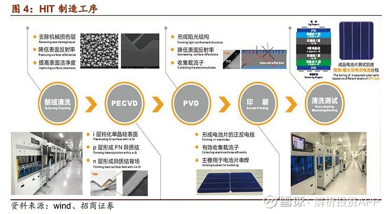 相比于传统的太阳能电池,具有行业前景的HIT电池的优点主要表现为:在效率方面,提升潜力比当前使用的PERC电池要高1.5%-2%。在成本领域,HIT电池结合了薄膜太阳能电池低温的制造优点,避免了传统的高温工艺,不仅大大的节约燃料能源,而且低温加工环境有利于实现HIT电池薄片化,减少硅的使用量,降低硅原料成本。另外,HIT工艺流程相对简化,全部生产流程只需四步即可完成,而PERC电池为了实现23.9%的转化效率,需要叠加多种技术,工艺步骤多达8步,由此带来了更高的成本。此外,HIT电池的低温度系数和更低的光致衰减,使得稳定性高,可有效降低热损失。